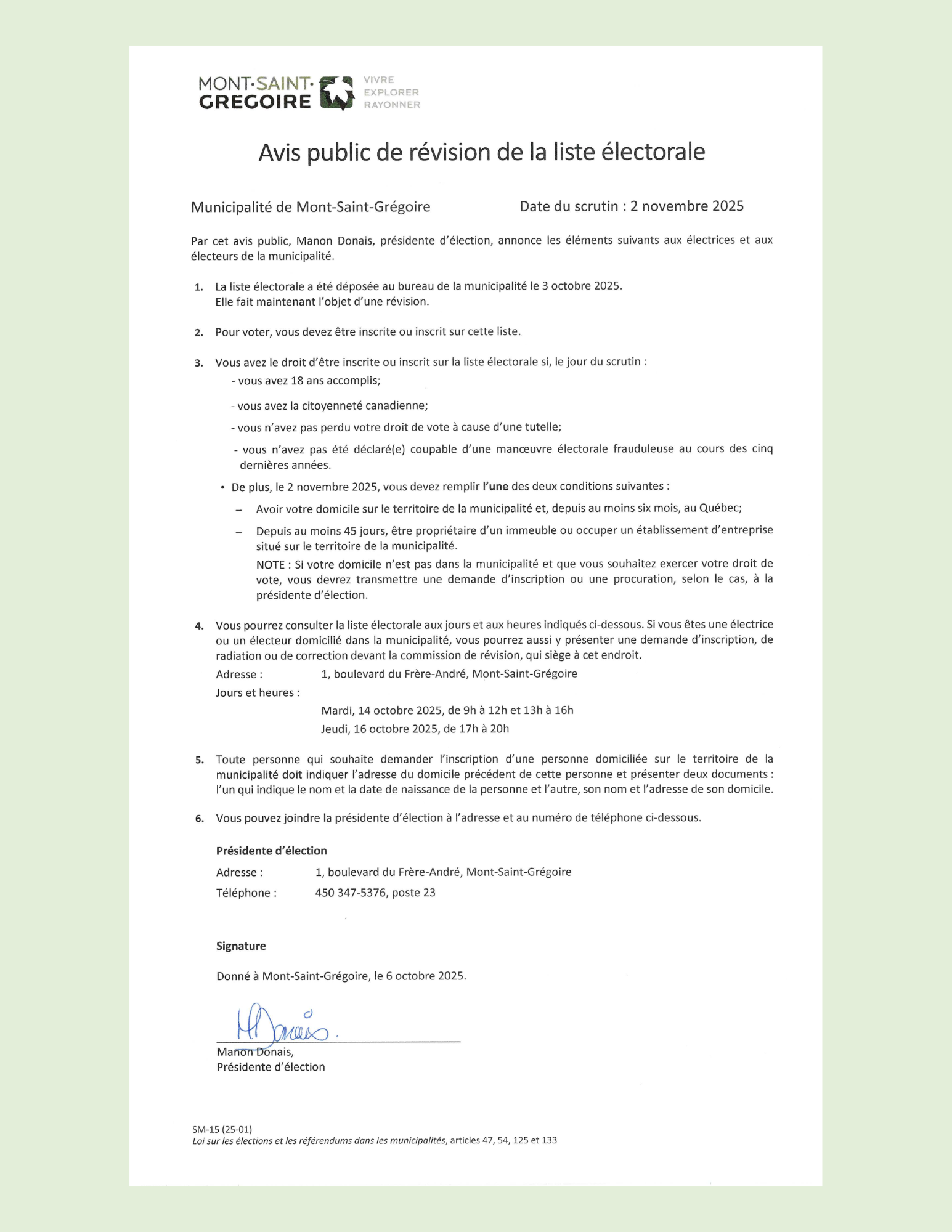 En  raison de l’interruption des services de Postes Canada (grève en cours), la Municipalité a procédé elle-même à la distribution des avis d’inscription à la liste électorale. Nous vous invitons à récupérer votre lettre intitulée « Êtes-vous inscrite ou inscrit sur la liste électorale municipale? » dans votre boîte aux lettres ou sur une de vos portes d’entrée.